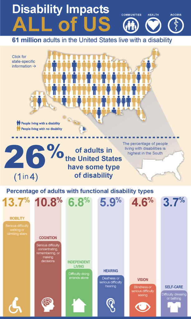 According to the CDC (Center for Disease Control and Prevention) more than 1 in 4 Americans have a disability in 2020. source